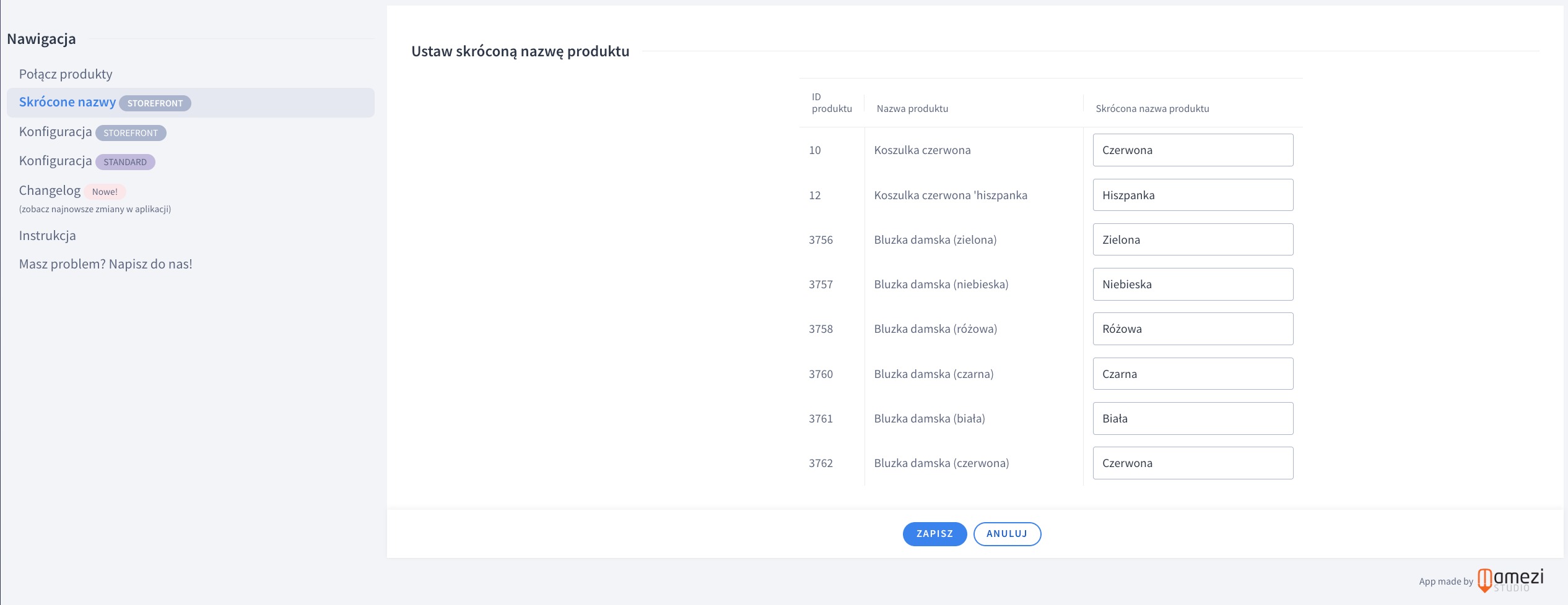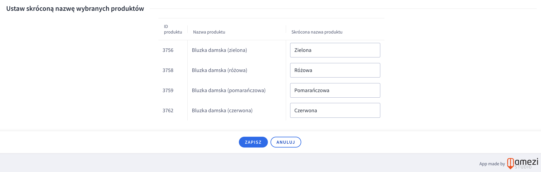 W kolumnie "Skrócona nazwa produktu" możesz wpisać skróconą nazwę produktu i kliknąć "Zapisz".