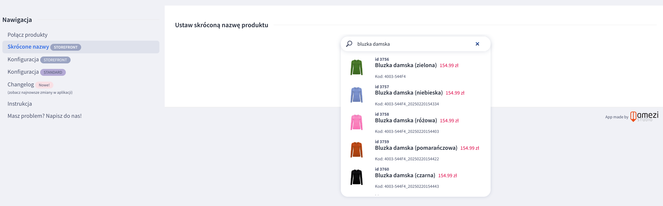 Przejdź do panelu aplikacji, do zakładki "Skrócone nazwy". Następnie w wyszukiwarce wpisz nazwę produktu, kliknij enter (lub ikonę lupki) i zaznacz szukany produkt na liście wyników.