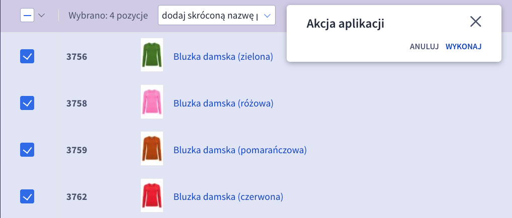 Przejdź do listy produktów i zaznacz interesujące Cię produkty. Z listy akcji wybierz "Dodaj skróconą nazwę produktu", a następnie kliknij "Wykonaj". Pojawi się okno z tabelą zawierającą zaznaczone produkty.