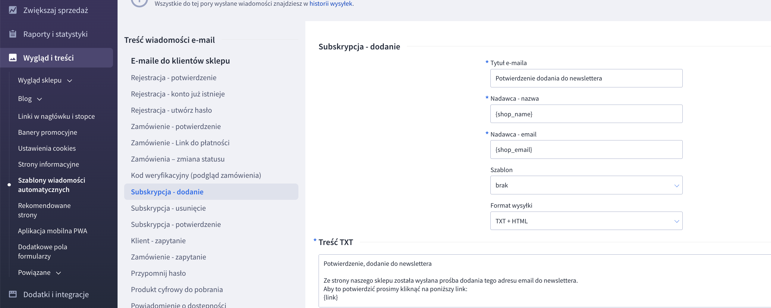 - sprawdź czy w pierwszej wiadomości do subskrybenta przesyłasz mu link do potwierdzenie subskrypcji. Szablon wiadomości znajdziesz w Wygląd i treści -> Szablony wiadomości automatycznych -> Subskrypcja - dodanie.